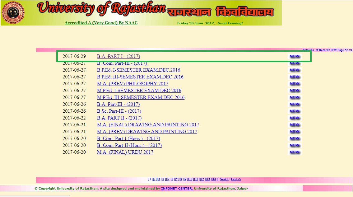 University of Rajasthan BA 1stYear Result 30-06-2017 –Regular & Private